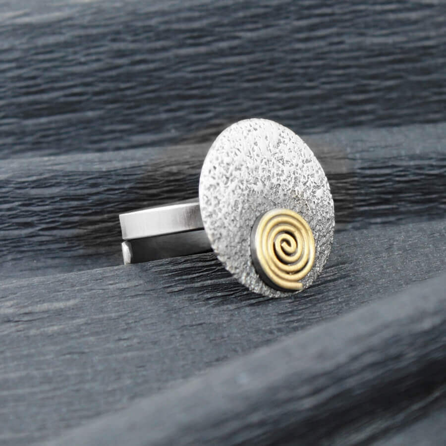 Autorski pierścionek srebrny z pozłacanym ślimaczkiem – unikatowa biżuteria artystyczna