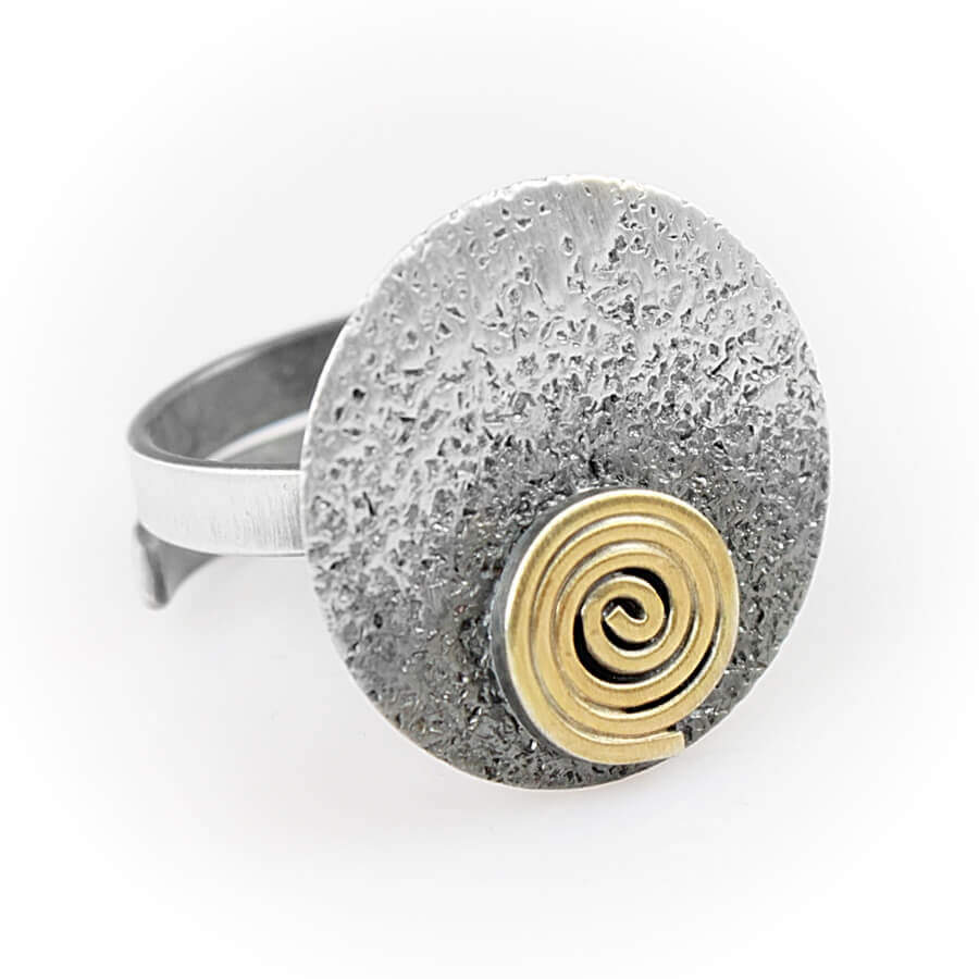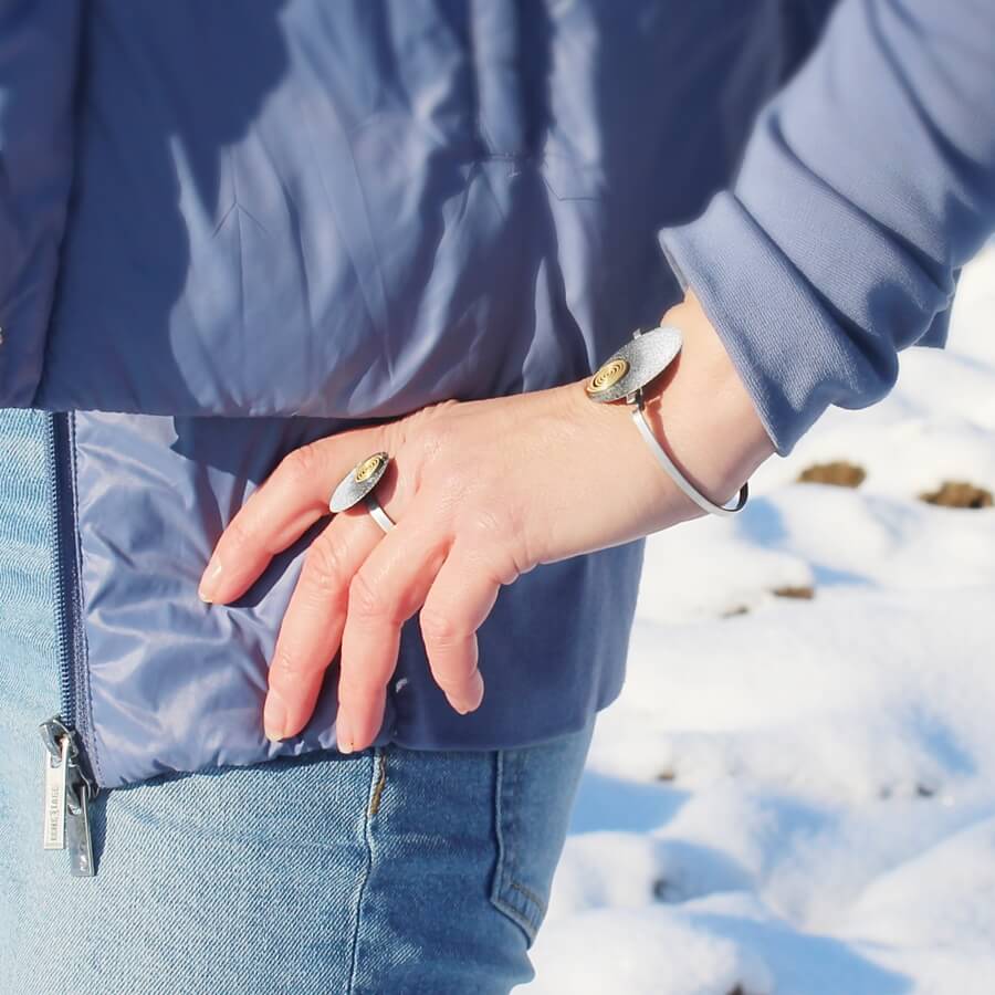 Wyjątkowy pierścionek srebrny handmade, który łączy nowoczesny styl z eleganckim, artystycznym charakterem. Okrągła forma (ok. 2,3 cm) została ręcznie fakturowana, aby uzyskać efekt szlachetnej, ziarnistej struktury. Powierzchnia została częściowo pokryta oksydą, co pięknie podkreśla relief i dodaje biżuterii głębi. Centralny motyw to pozłacany ślimaczek ze srebra – symbol rozwoju, harmonii i spokojnej siły. To pierścionek, który doskonale uzupełnia zarówno proste, nowoczesne stylizacje, jak i te bardziej wyraziste. Świetnie prezentuje się solo, ale równie ciekawie wygląda w zestawie z pozostałymi elementami kolekcji.
