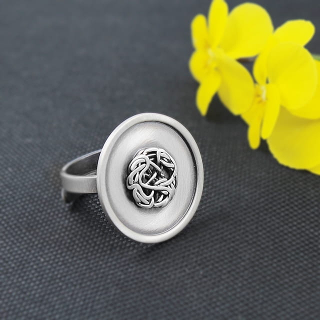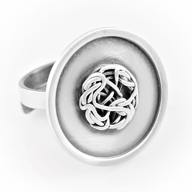 Imponujący, niezwykle oryginalny, wyraźny pierścionek srebrny. Powierzchnia elementu ozdobnego o średnicy około 2,5 cm została zoksydowana, następnie satynowana na mat, w środku "plecionka" została wykonany z ręcznie zaplecionego drucika srebrnego. Pierścionek jest regulowany (istnieje możliwość dopasowania do indywidualnych potrzeb), na szynie około 3 mm. Projekt autorski.