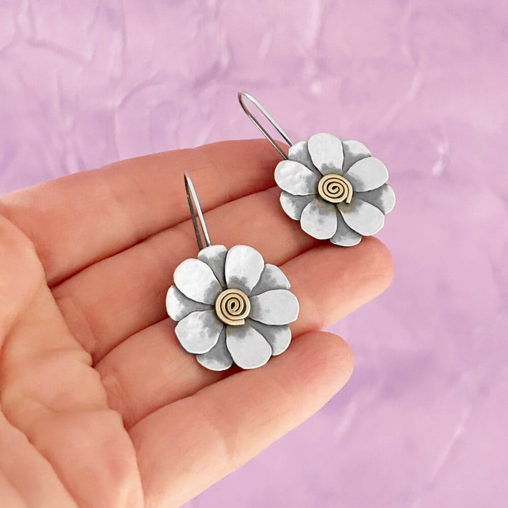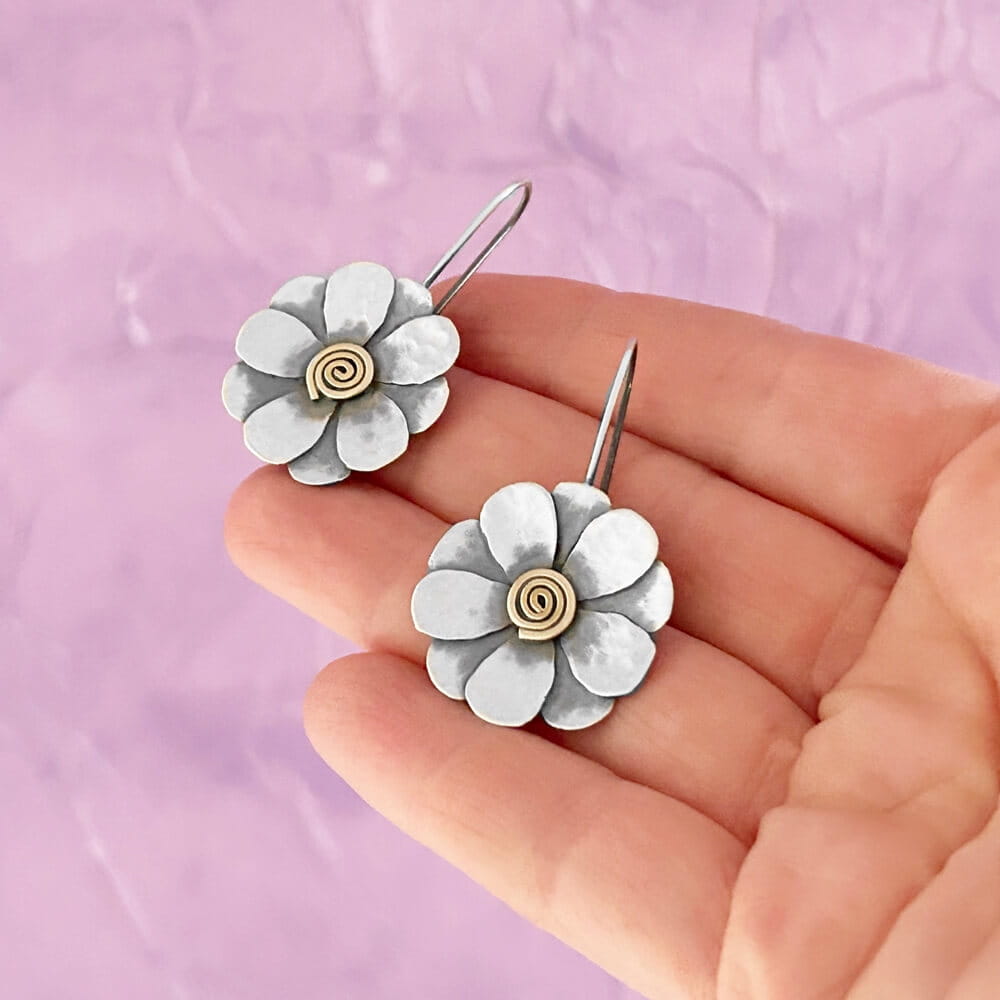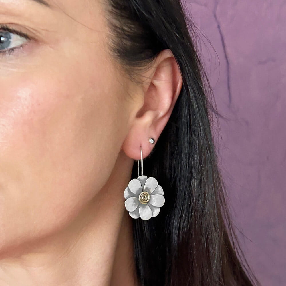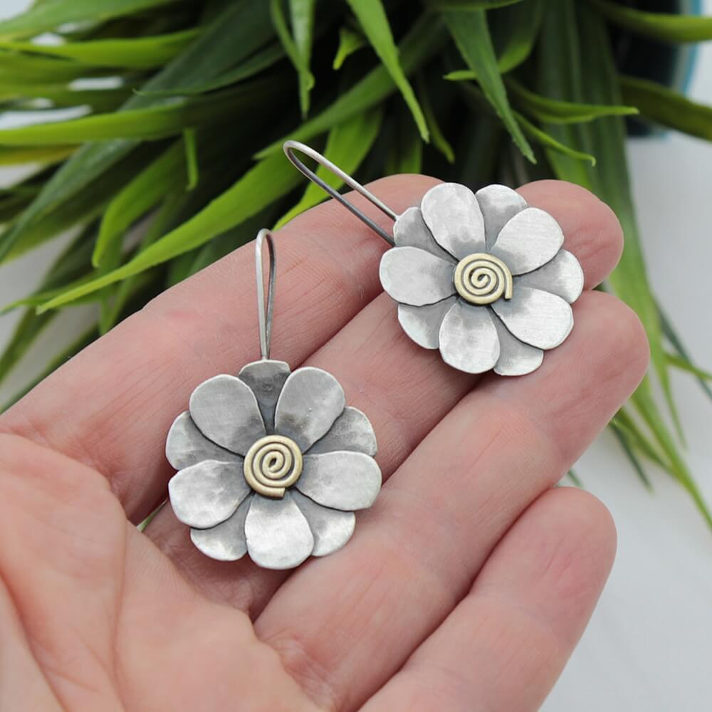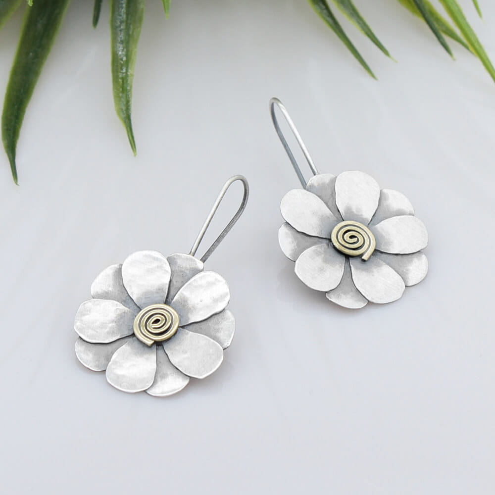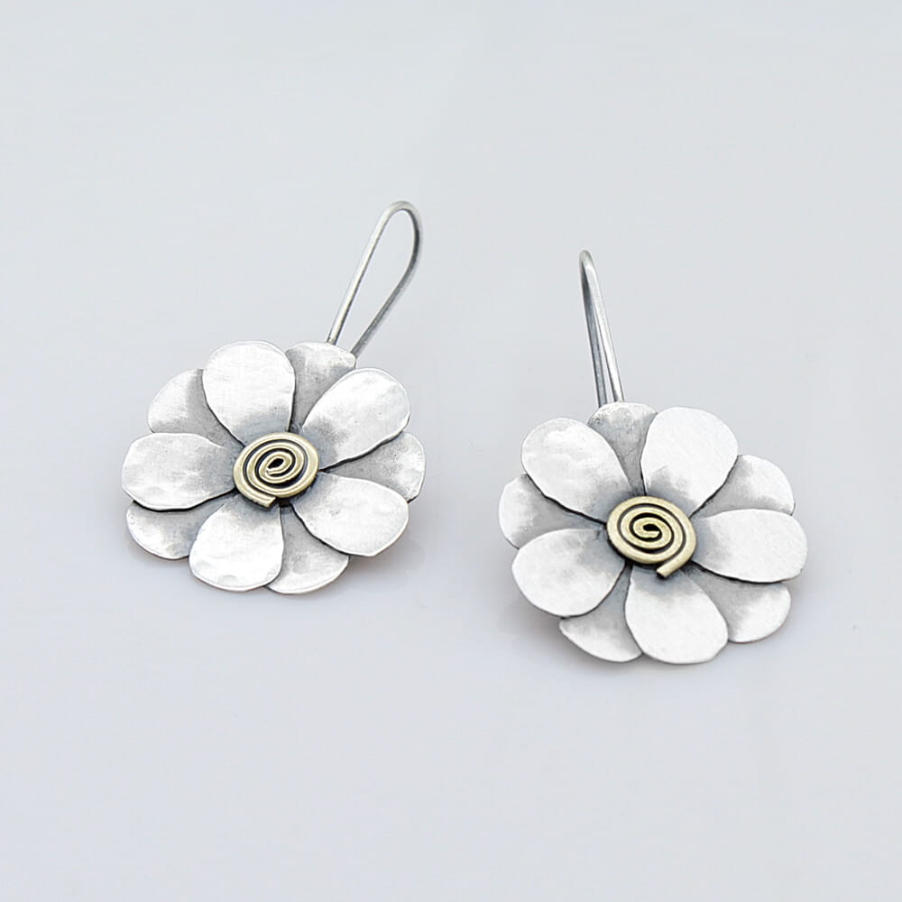 Te autorskie kolczyki srebrne to propozycja dla kobiet, które cenią niebanalną, ręcznie wykonaną biżuterię artystyczną. Kwiatowy motyw wycięty ze srebra próby 925 został delikatnie wymłotkowany, a następnie zaoksydowany, by uwypuklić fakturę i nadać kolczykom głębi. Środek kwiatów zdobi spiralny detal wykonany z mosiądzu, który tworzy subtelny kontrast z ciemniejszym, matowym srebrem. Kolczyki zawieszone są na eleganckim, zamykanym biglu – dzięki czemu dobrze trzymają się ucha i są wygodne w noszeniu. Ich średnica wynosi ok. 2,6 cm, a długość całkowita to ok. 4,5 cm. Projekt autorski.