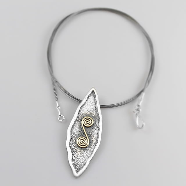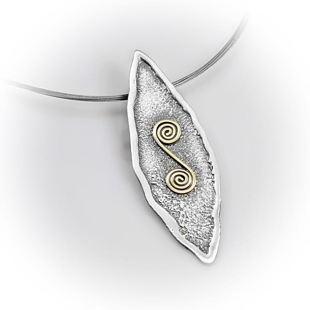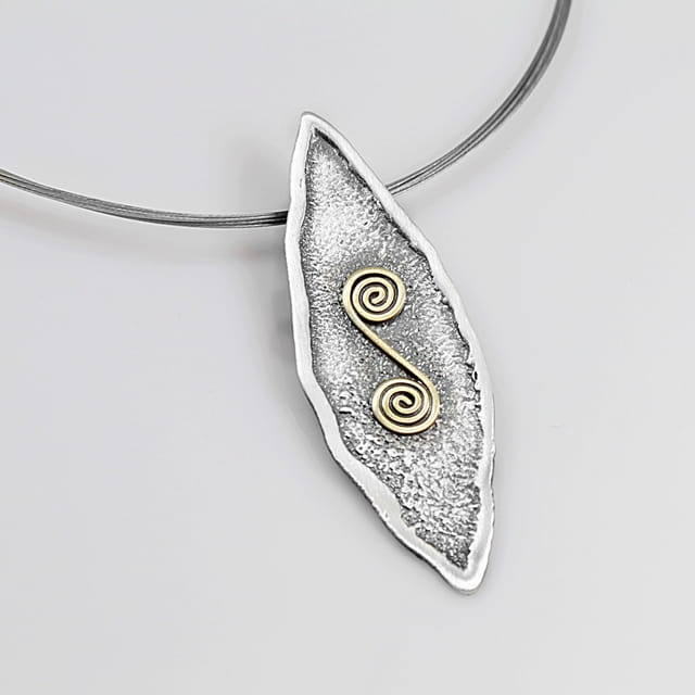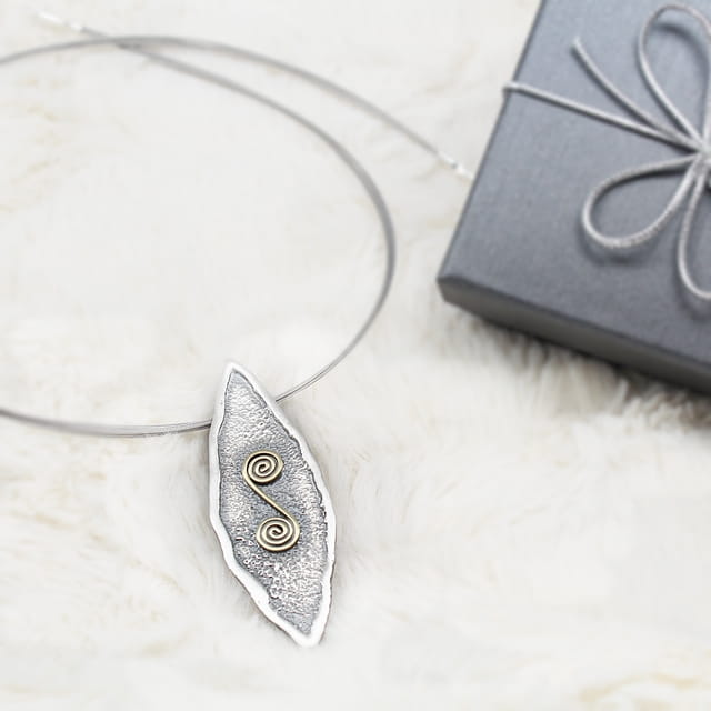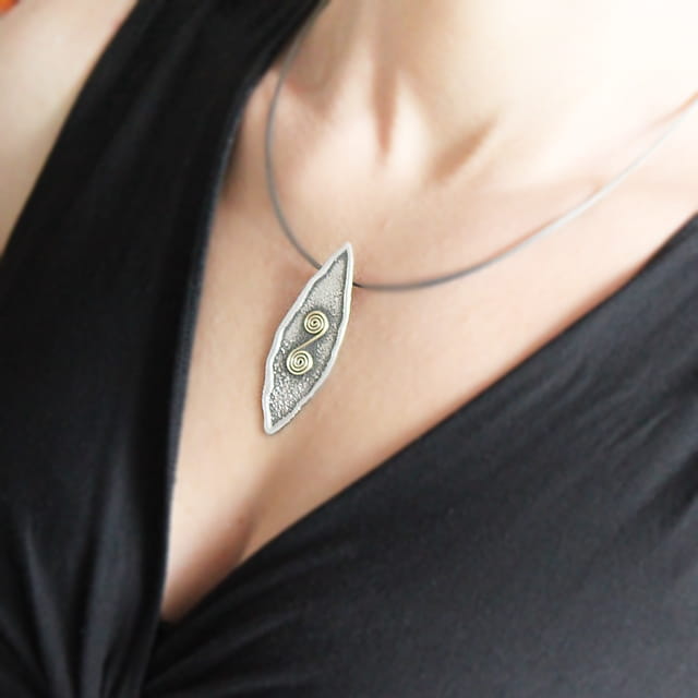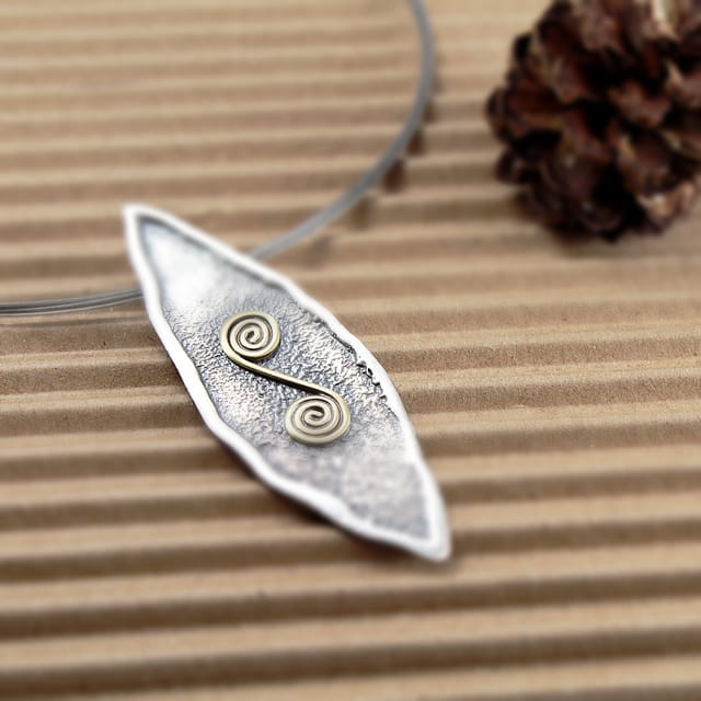 Naszyjnik „Ślimaczek” to eleganckie połączenie ciemnego, oksydowanego srebra i dekoracyjnego elementu z mosiądzu w kształcie spiralnej formy. Zawieszka o miękkiej, organicznej linii zachwyca subtelną formą, a jej struktura nadaje biżuterii artystycznego charakteru. To naszyjnik ręcznie robiony, który urzeka prostotą i oryginalnością jednocześnie.