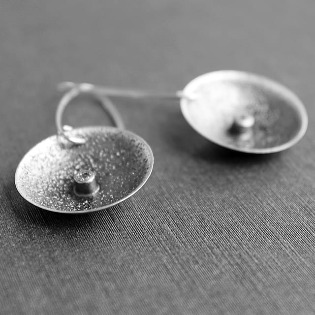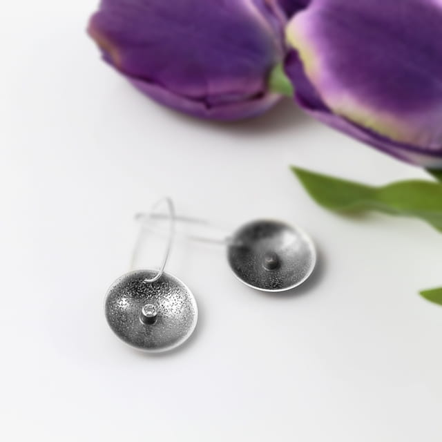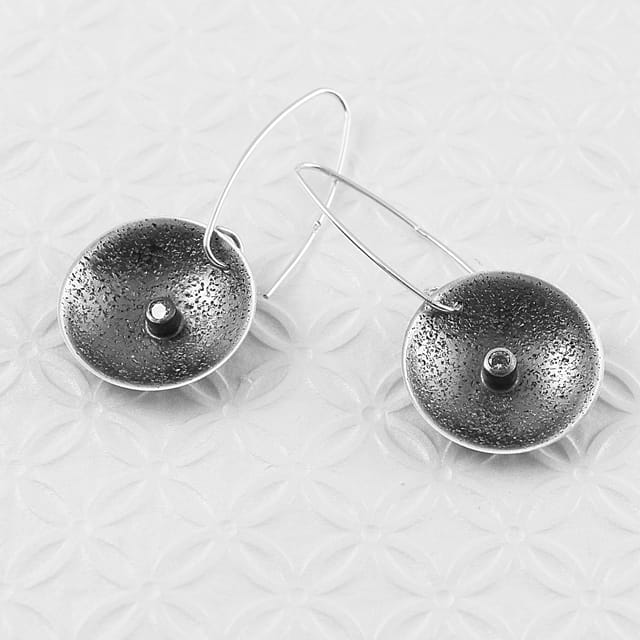 Nietuzinkowe kolczyki srebrne o średnicy około 2,6 cm, na wiszącym, długim biglu, forma wklęsła. Powierzchnia to wyraźna i ciekawa faktura, która została uwydatniona poprzez zoksydowanie, a następnie wypolerowanie. W środku osadzona mała cyrkonia nadaje biżuterii niezwykle eleganckiego wyglądu. Kolczyki dodadzą uroku niejednej stylizacji. Do kolczyków dołączone są silikonowe zatyczki. Projekt autorski.