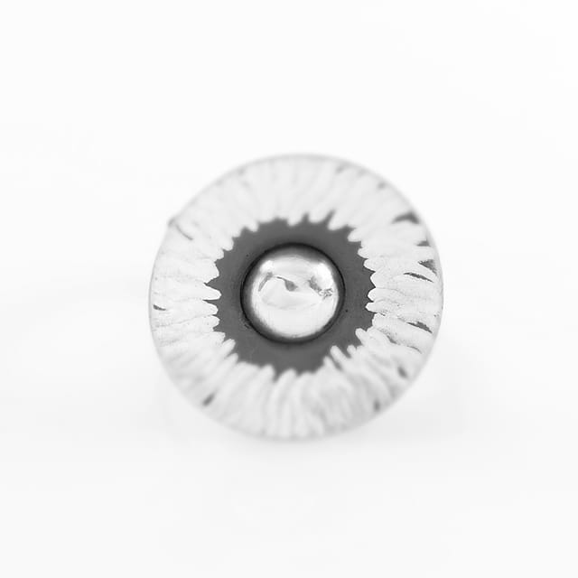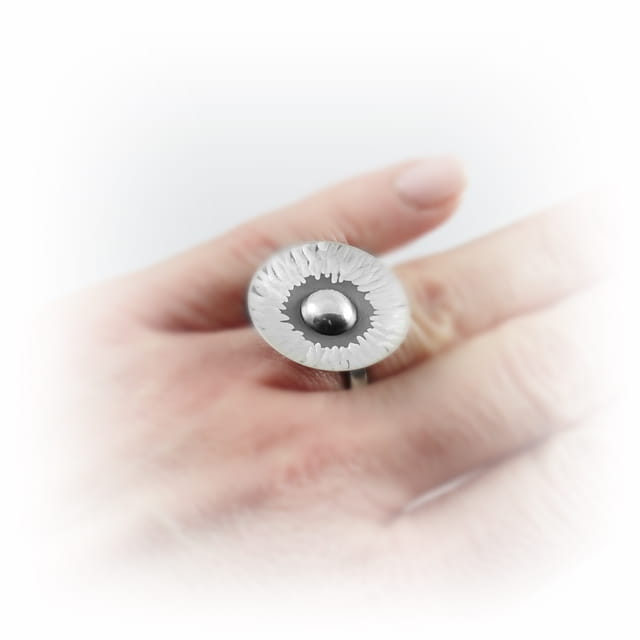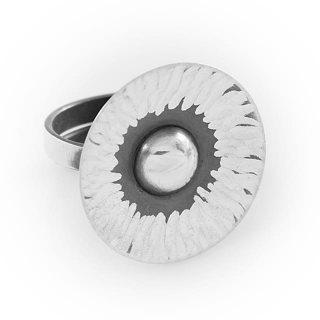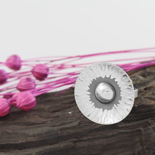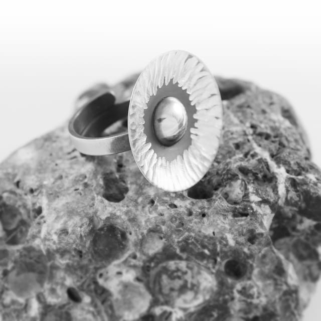 Pierścionek srebrny - okazały, z charakterem, a jednocześnie subtelny bo stworzony od podstaw ręcznie. Wyraźna struktura pięknie odbija od czarnej, zoksydowanej powierzchni. W środku półkulka wykonana na wysoki połysk. W całości pierścionek bardzo elegancko wygląda. Pierścionek jest regulowany (istnieje możliwość dopasowania do indywidualnych potrzeb), na szynie około 3 mm. Projekt autorski.
