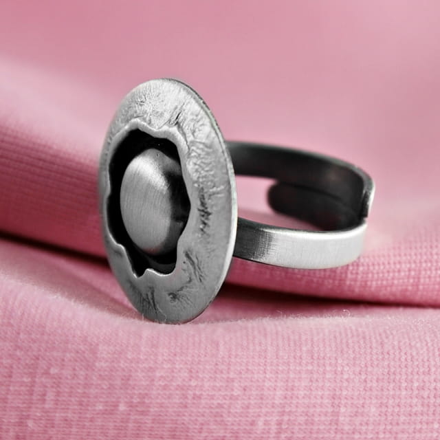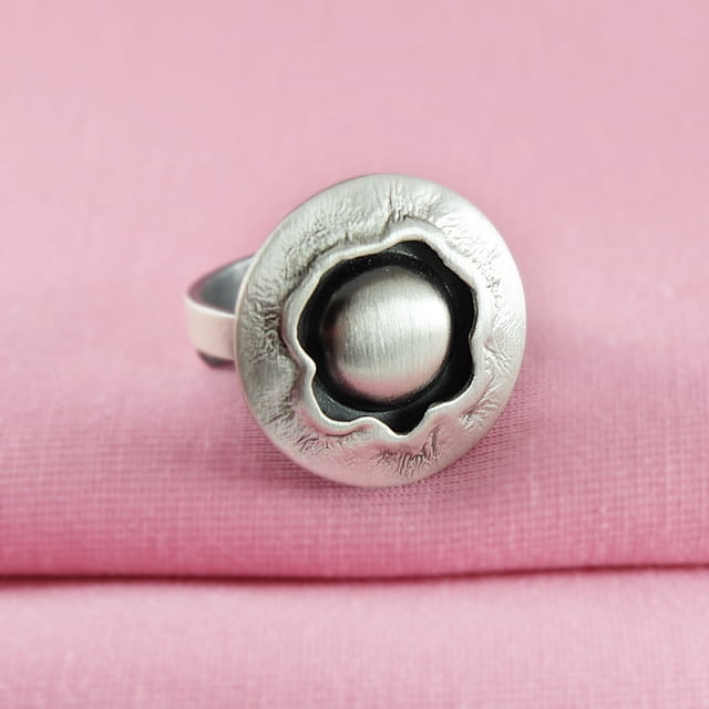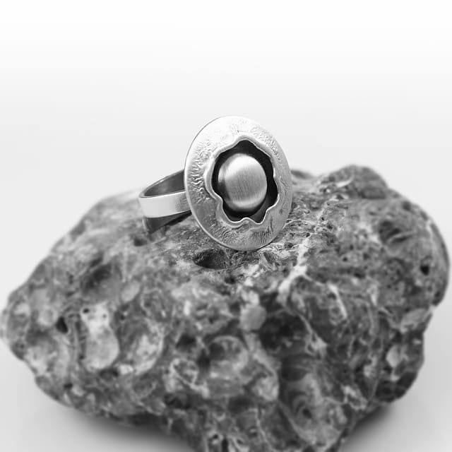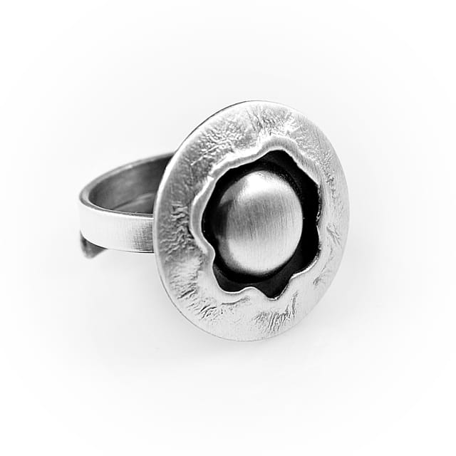 Subtelny i wyrafinowany pierścionek srebrny to propozycja dla kobiet, które kochają chłodny blask metalu i ponadczasową elegancję. Model został wykonany ze srebra próby 925 i wykończony w technice satynowania oraz oksydowania, co nadaje mu wyjątkową głębię i szlachetny charakter. W centrum kompozycji znajduje się srebrna półkula – gładka, matowa, subtelnie kontrastująca z fakturowanym rantem. Całość tworzy nowoczesną, minimalistyczną formę o wyrazistym artystycznym stylu.