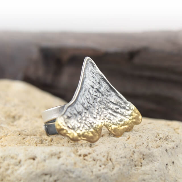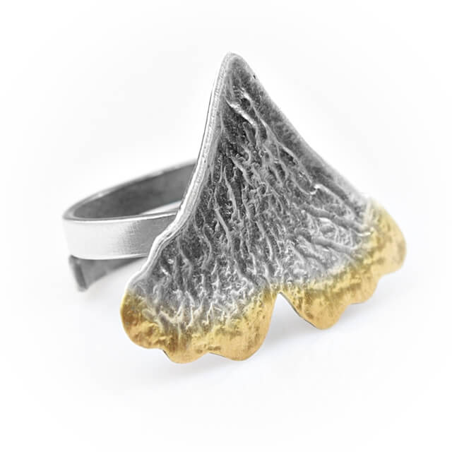 Ten artystyczny pierścionek ze srebra próby 925 inspirowany jest liściem miłorzębu – symbolem długowieczności, wewnętrznej równowagi i odporności. Organiczna forma liścia została wzbogacona o pozłacane końcówki, które subtelnie rozświetlają kompozycję i nadają jej bardziej biżuteryjny, elegancki charakter. Cieniowana powierzchnia, powstała w procesie oksydowania i ręcznego rozjaśniania, podkreśla strukturę i naturalny rytm formy, sprawiając, że pierścionek pięknie pracuje ze światłem.