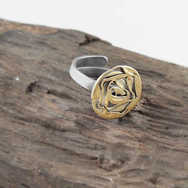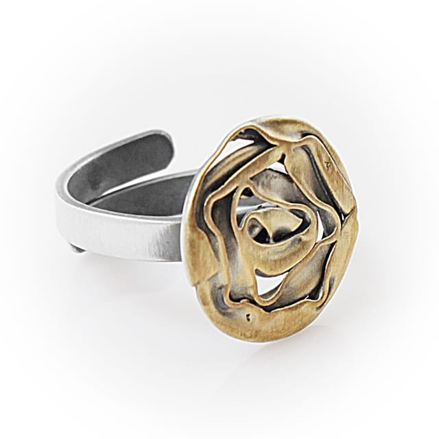 Srebrny pierścionek regulowany z pozłacaną różyczką