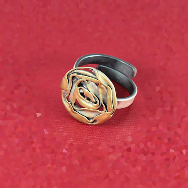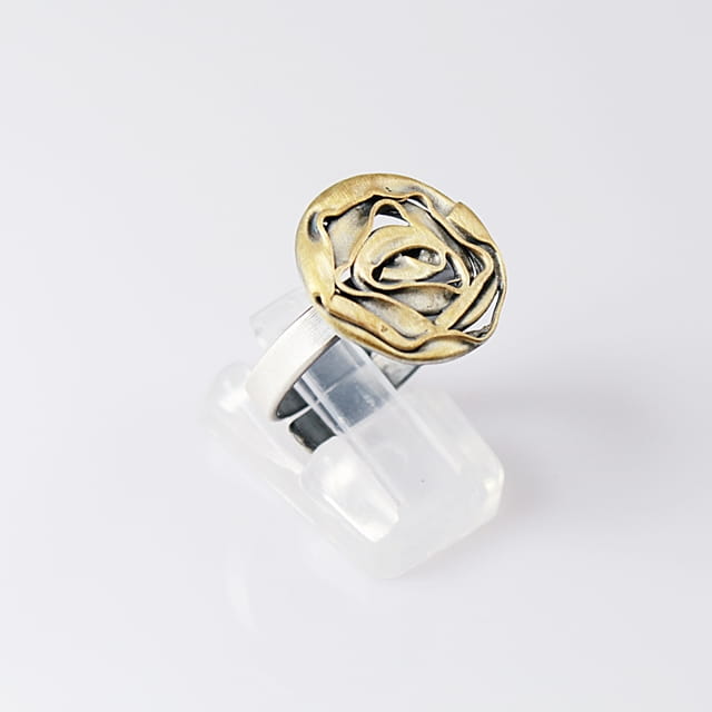 Elegancki i oryginalny pierścionek srebrny, element ozdobny w kształcie różyczki o średnicy około 1,8 cm, zoksydowany i pozłocony. Pierścionek jest regulowany (istnieje możliwość dopasowania do indywidualnych potrzeb), na szynie około 3 mm.