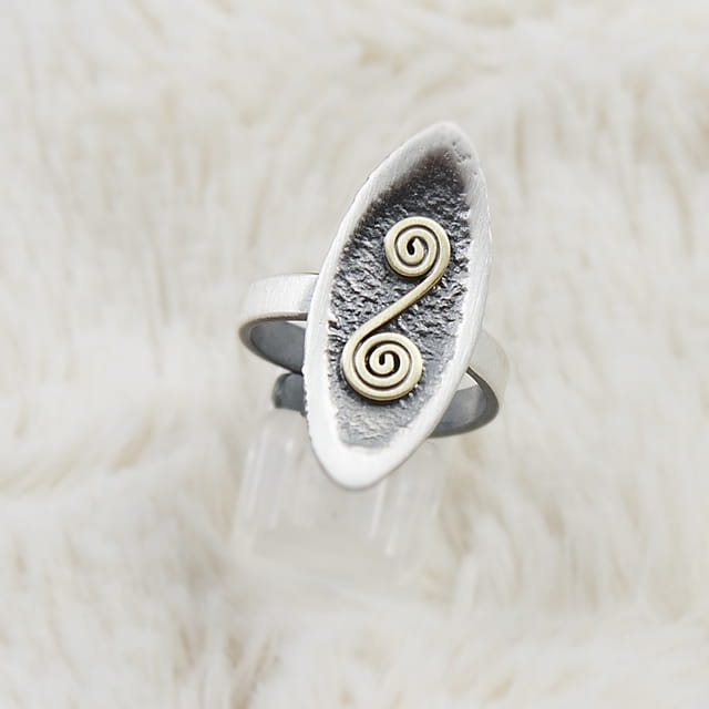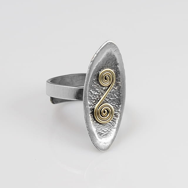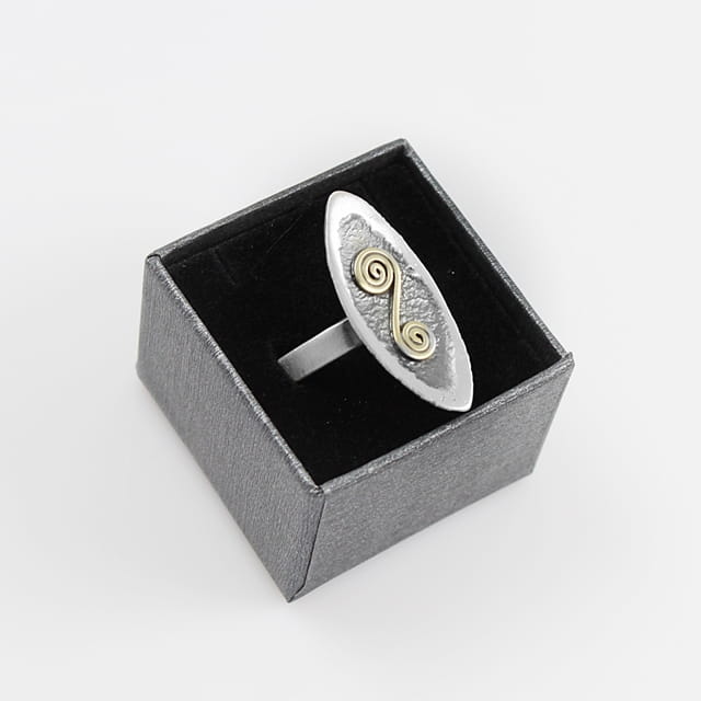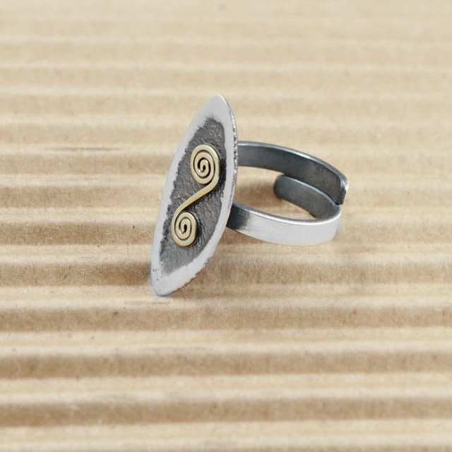 Ciekawy pierścionek srebrny w kształcie łezki o wymiarach elementu około 3 x 1,2 cm. Powierzchnia z interesującą fakturą, lekko chropowatą, częściowo zoksydowaną (przyciemnioną) w środku ślimaczek wykonany z drutu mosiężnego, rant w kolorze srebrnym, matowym. Pierścionek jest regulowany (istnieje możliwość dopasowania do indywidualnych potrzeb), na szynie około 3 mm.