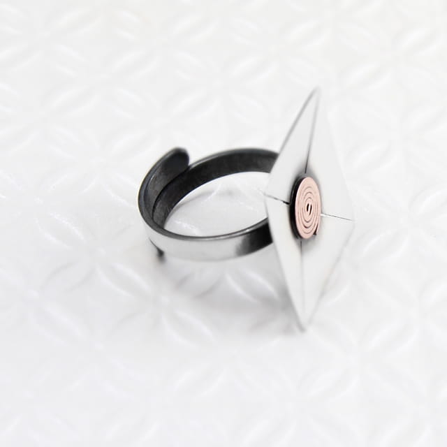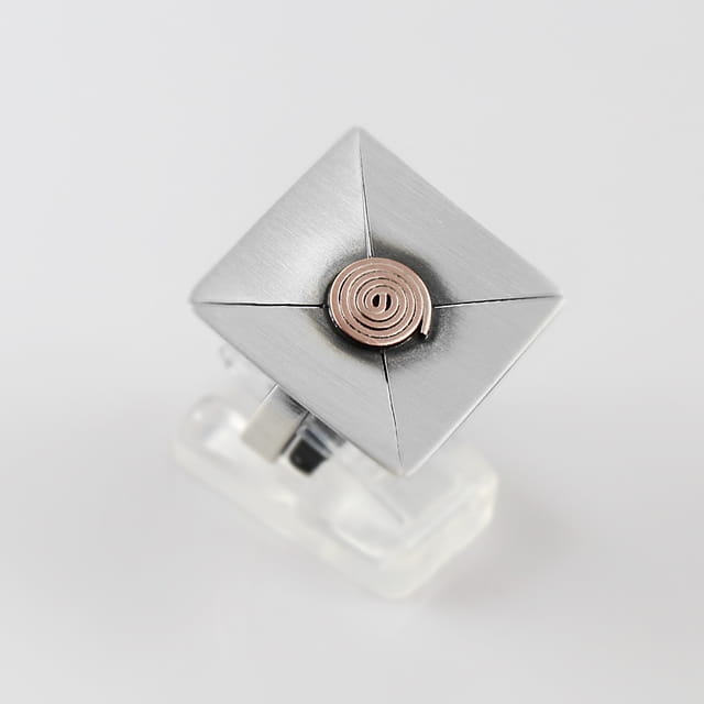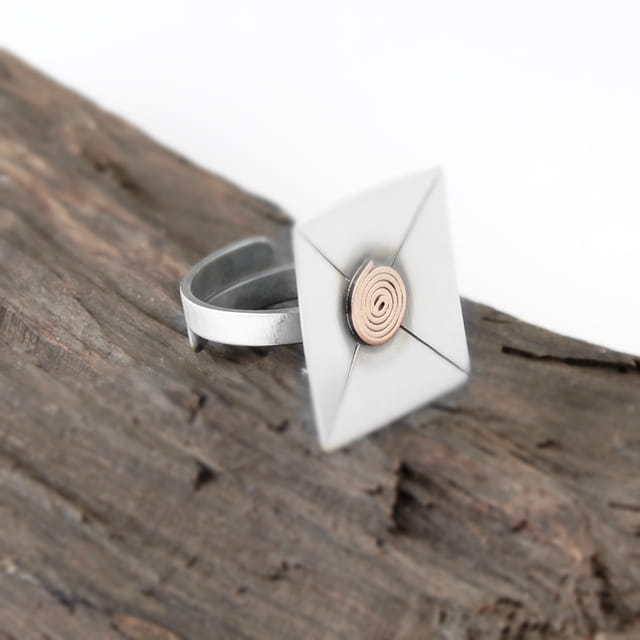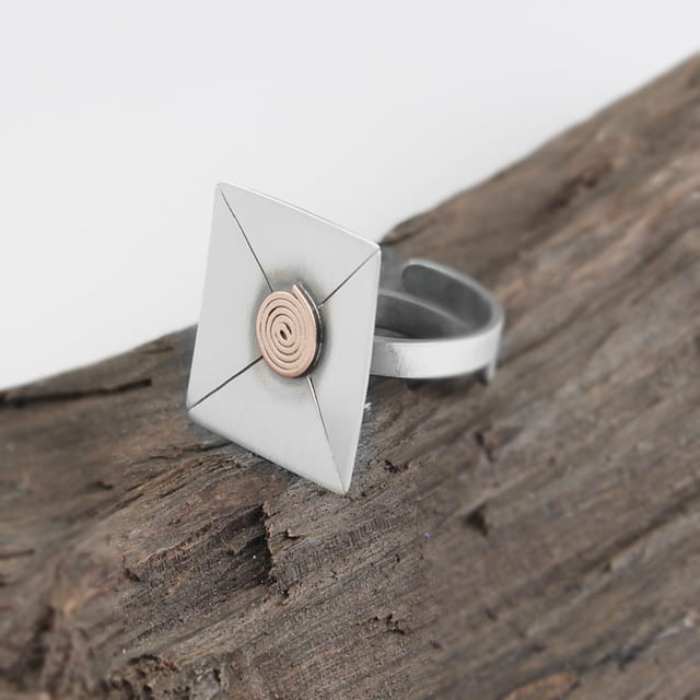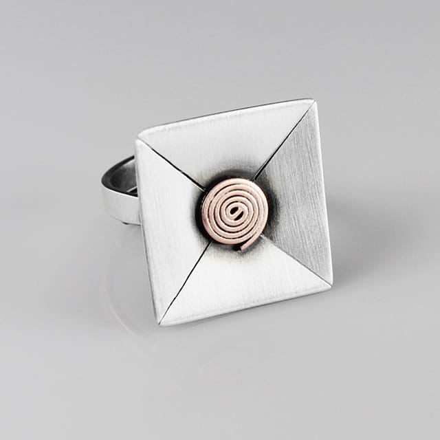 Prosty a zarazem bardzo elegancki i efektowny pierścionek srebrny. Element ozdobny o wymiarach 2,2 x 2,2 cm. Powierzchnia zoksydowana, następnie satynowana na mat, w środku ślimaczek wykonany z miedzi. Pierścionek jest regulowany (istnieje możliwość dopasowania do indywidualnych potrzeb), na szynie około 3 mm.
