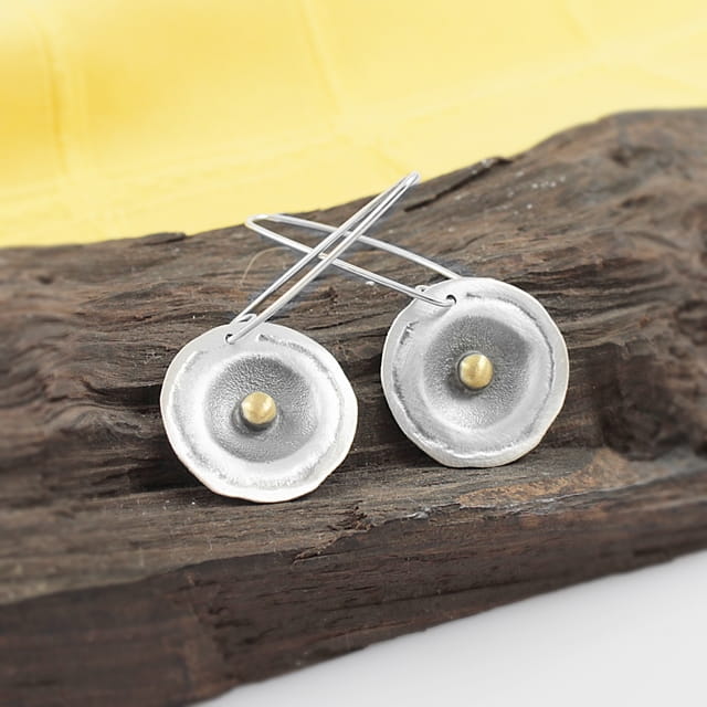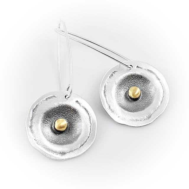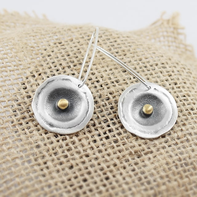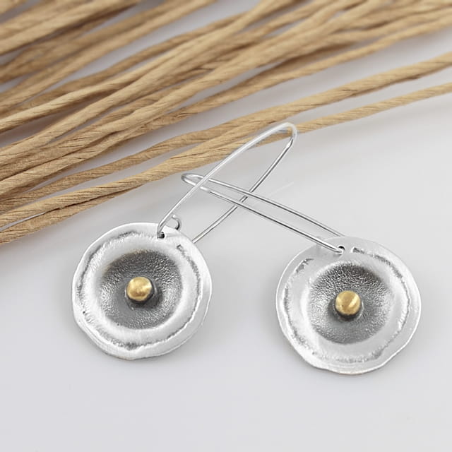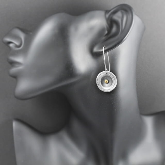 Kolczyki srebrne o nieregularnym kształcie koła o średnicy około 2,2 cm, na wiszącym, długim biglu. Całość oksydowana i przetarta dla podkreślenia istniejącej faktury, w środku element ozdobny w kształcie kuleczki, pozłocony. Do kolczyków dołączone są silikonowe zatyczki. Projekt autorski.